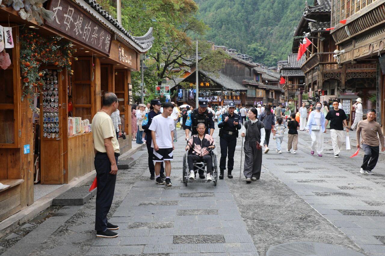 10月1日,西江千户苗寨景区芦笙场民族原生态歌舞表演现场人群熙熙攘攘。此时,一对夫妻正推着轮椅上的一名妇女在拥挤的人群中艰难行走。正在执勤的黔东南旅游警察小分队民警敏锐地发现了这一情况,立即上前询问:“您好,看你们行动不便,需要帮助吗?”游客赶忙说道:“能帮忙推一下我母亲吗?”民警毫不犹豫地回复:“可以的!”
